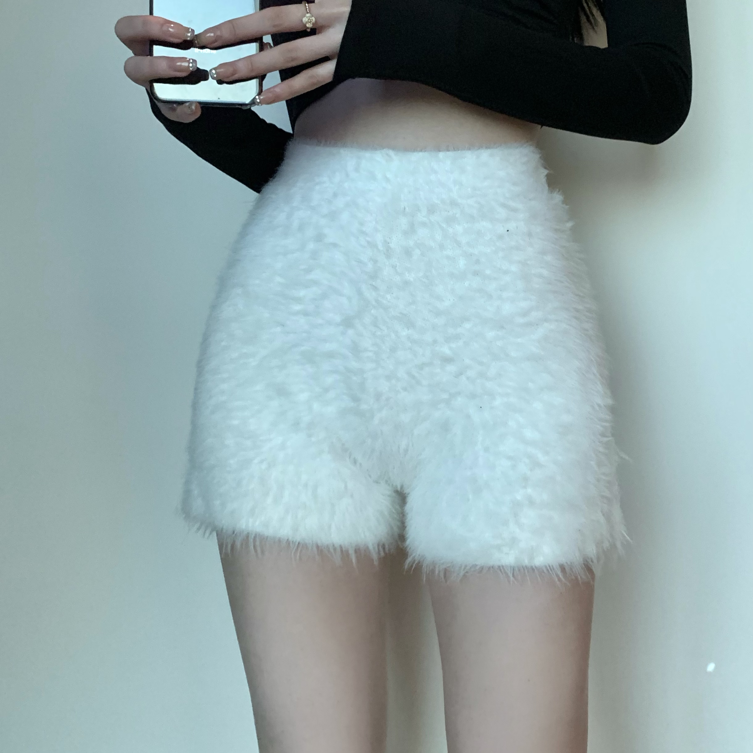 秋冬季高腰显瘦白色加厚毛毛保暖短裤子女外穿弹力...