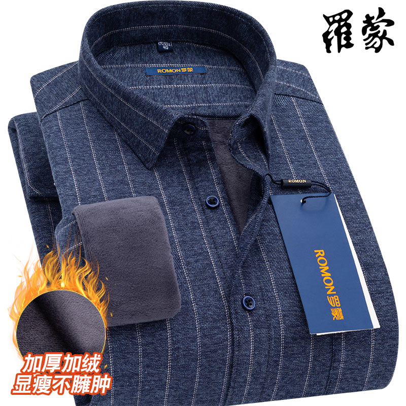 Romon/罗蒙保暖男衬衫冬季加绒加厚条纹纯棉厚款宽...
