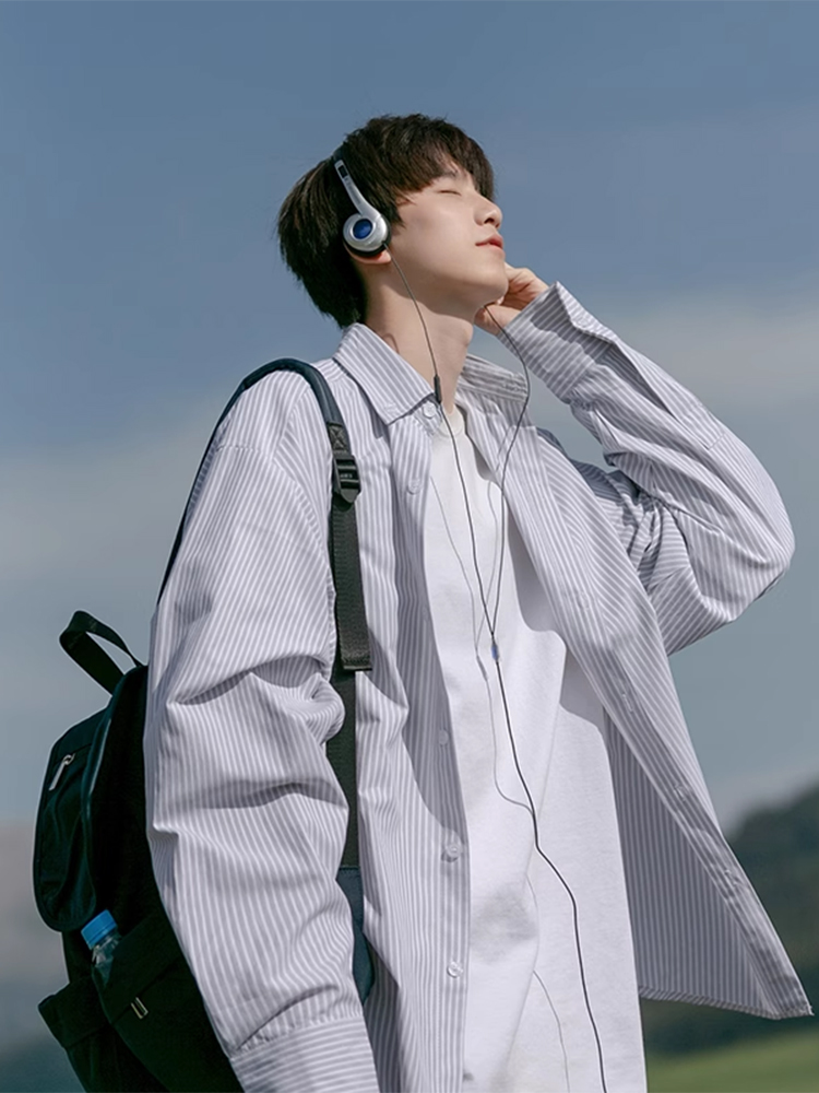 日系条纹衬衫男长袖春秋新款宽松休闲衬衣潮牌ins百...