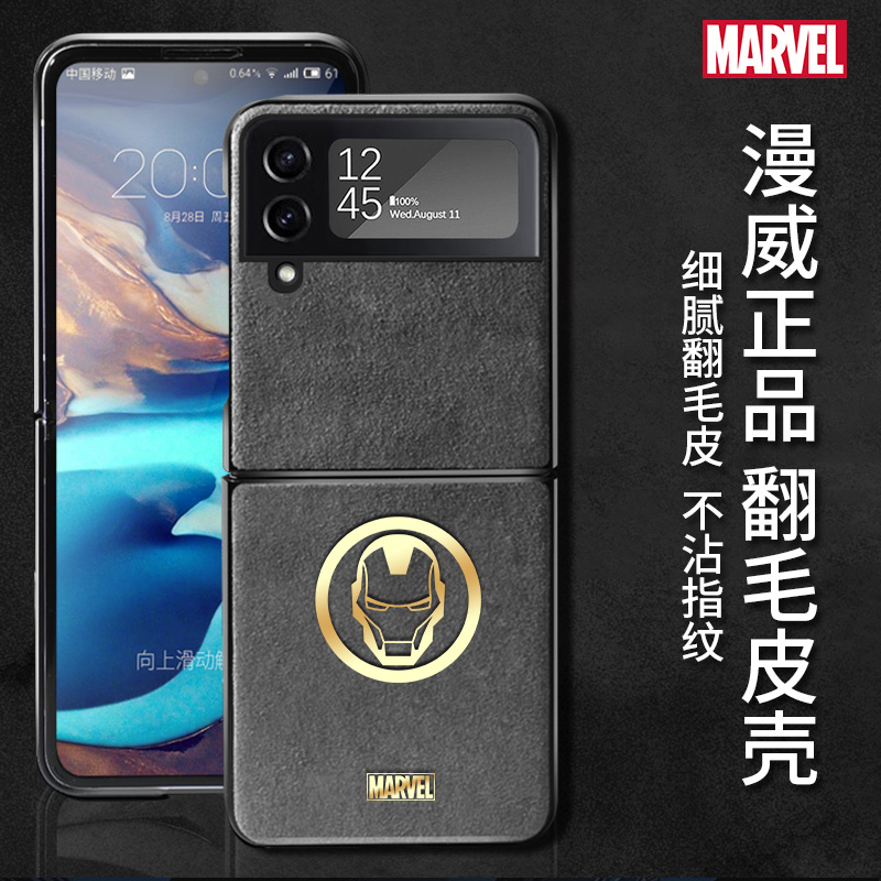 适用三星ZFlip4手机壳Z Fold4漫威金属标翻毛皮Flip...