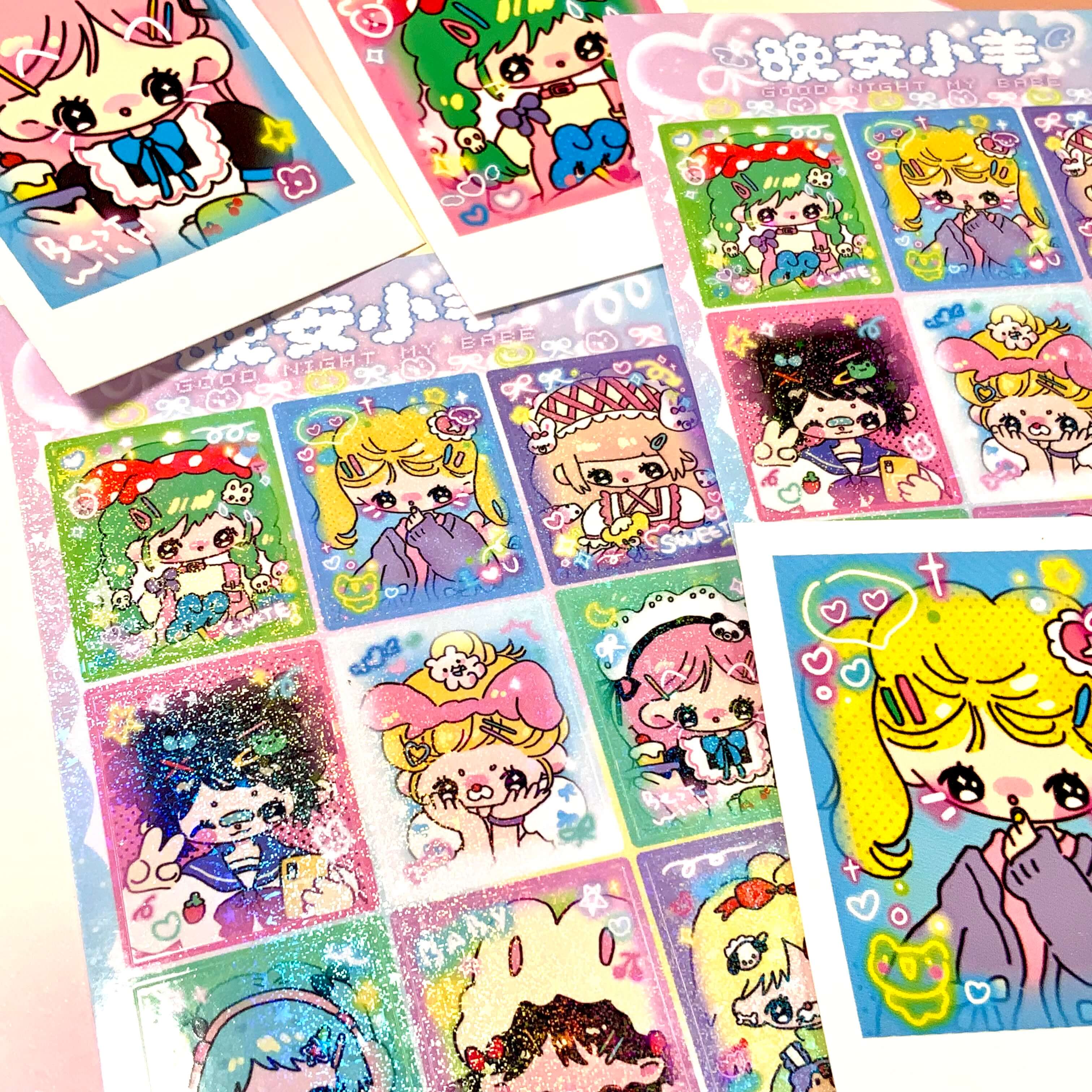晚安小羊原创少女心甜酷女孩大头贴手帐装饰闪膜贴纸