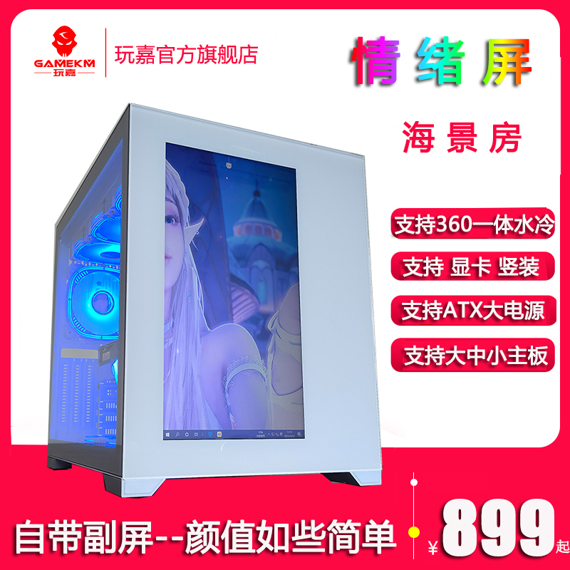 玩嘉情绪屏电脑机箱台式机ATX海景房带副屏360水冷4...